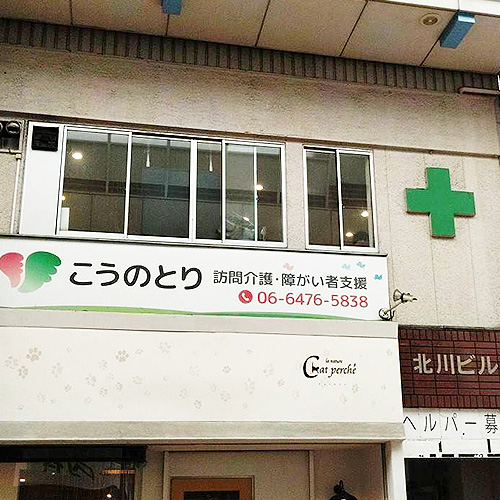 「塚本駅」西口を出てから商店街「サンリバー柏里」に入ってください。商店街の入口からまっすぐ進み、進行方向に対して左側に北川ビルがございます。北川ビルの外壁(2階)を確認すると、訪問介護事業所「こうのとり」の看板がございます。