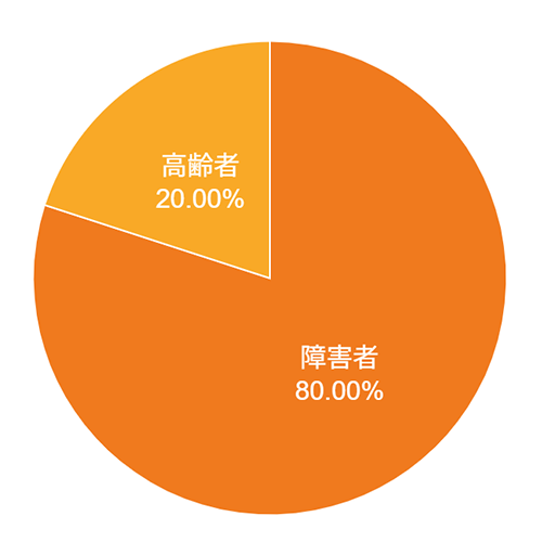 障がいのある方が全体の80%、高齢の方が20%です。障がいの内容は知的障害と身体障害が半分ずつ程度で、高齢の方は要介護1~2の方が中心です。